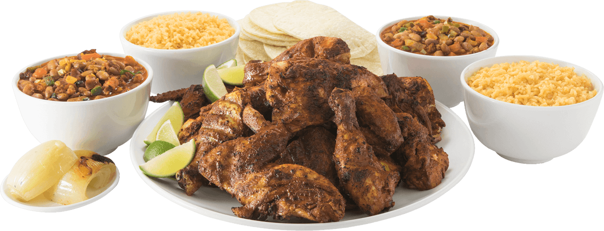 16 piezas de nuestro pollo asado al mezquite. Se sirve con dos complementos grandes de arroz y frijoles charros, 20 tortillas de maíz, 2 cebollas asadas y dos limones.
